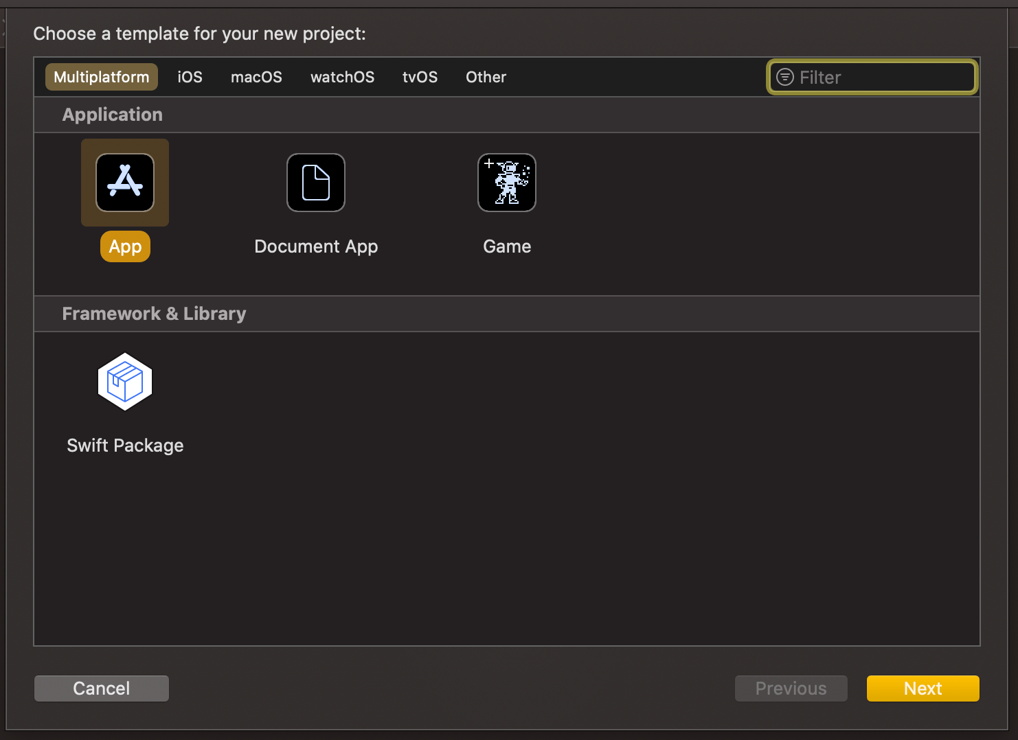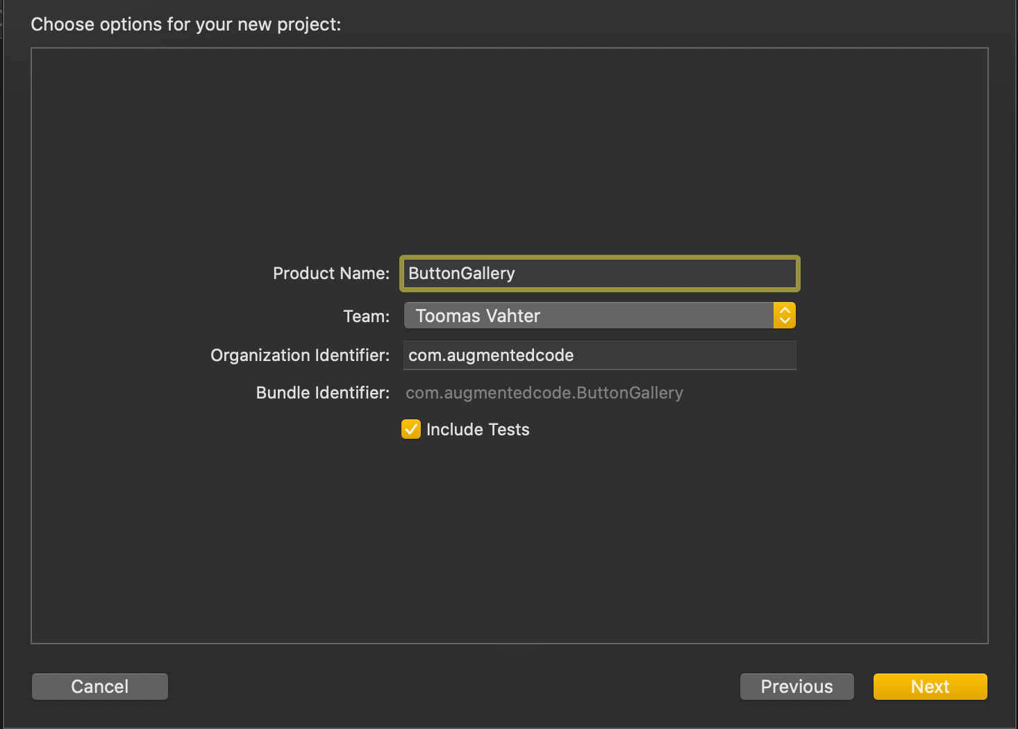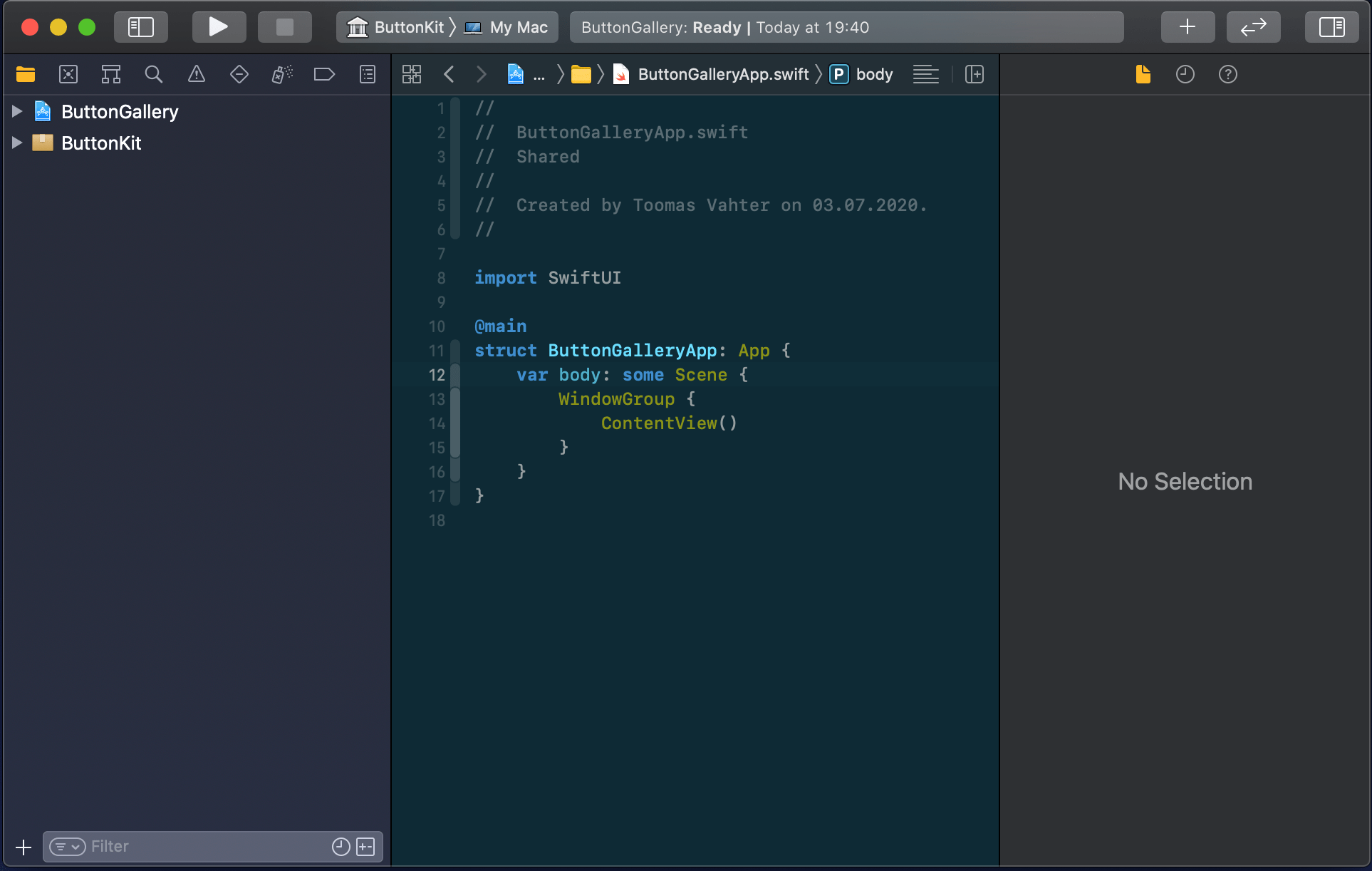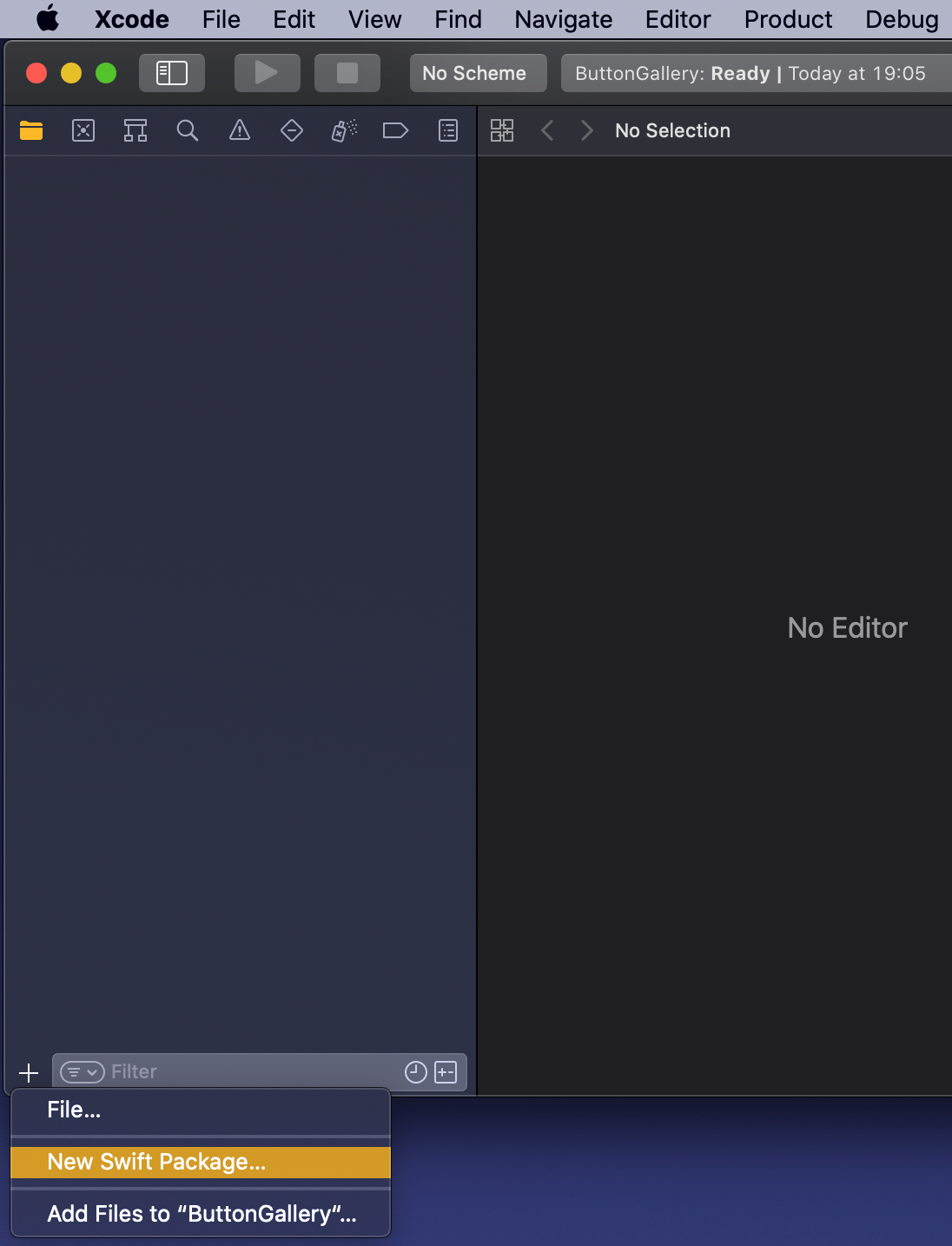 The app project will have a name “ButtonGallery” and the Swift package will have a name “ButtonKit”. But first, let’s create a folder named “SwiftPackageAppWorkspace” which is the root folder of the project. The app project and the Swift package will go to that folder in separate folders.