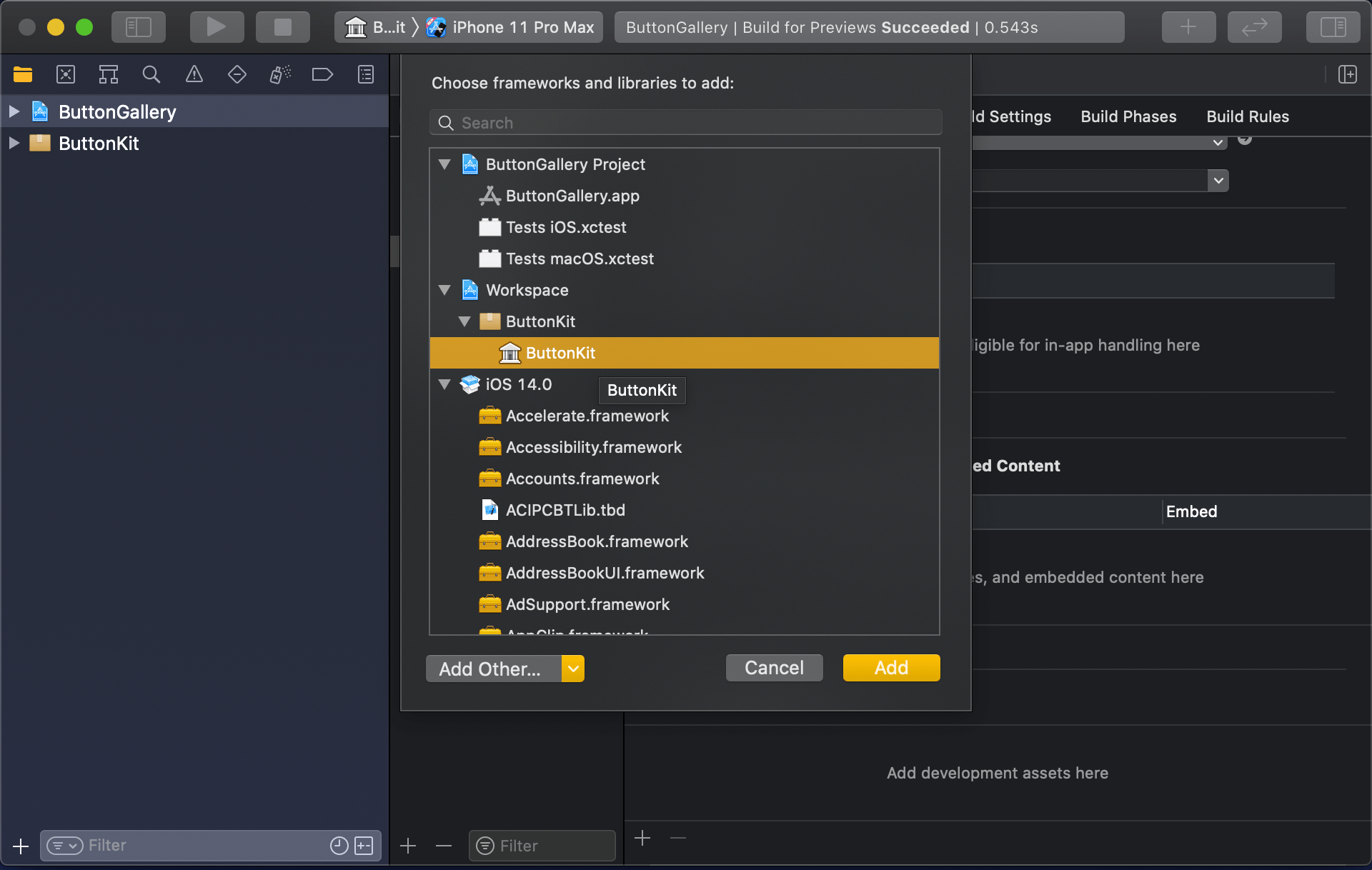 Swift package needs to be added to the app target: select “ButtonGallery” in the project navigator, click on the iOS target, General, and then on the plus button in the “Frameworks, Libraries, and Embedded Content” section, select the “ButtonKit” library.