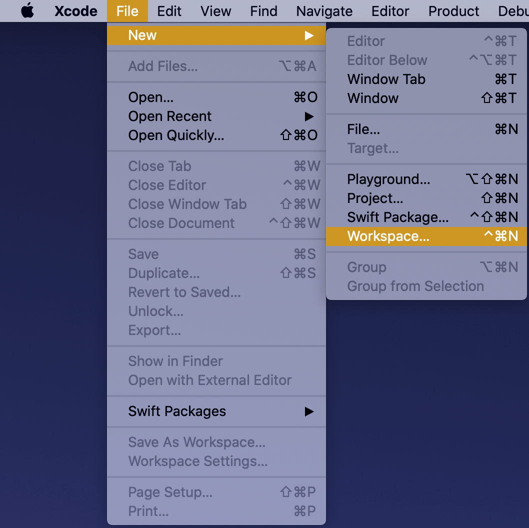 Selecting a new workspace in the main menu.Using the plus button in the workspace for creating a new package.Saving Swift package in the root folder.Adding a new Xcode project.Selecting template for the project.Adding a name to the app project.Saving a new app project and adding to an existing workspace.Workspace with a Swift package and an app project.