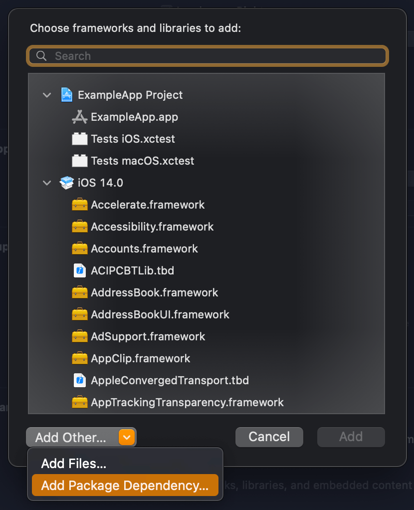The next step is to change app project settings and make sure we do not link the package in release builds. The simplest way for this is to first add the package as the app dependency in “Frameworks, Libraries, and Embedded Content”.