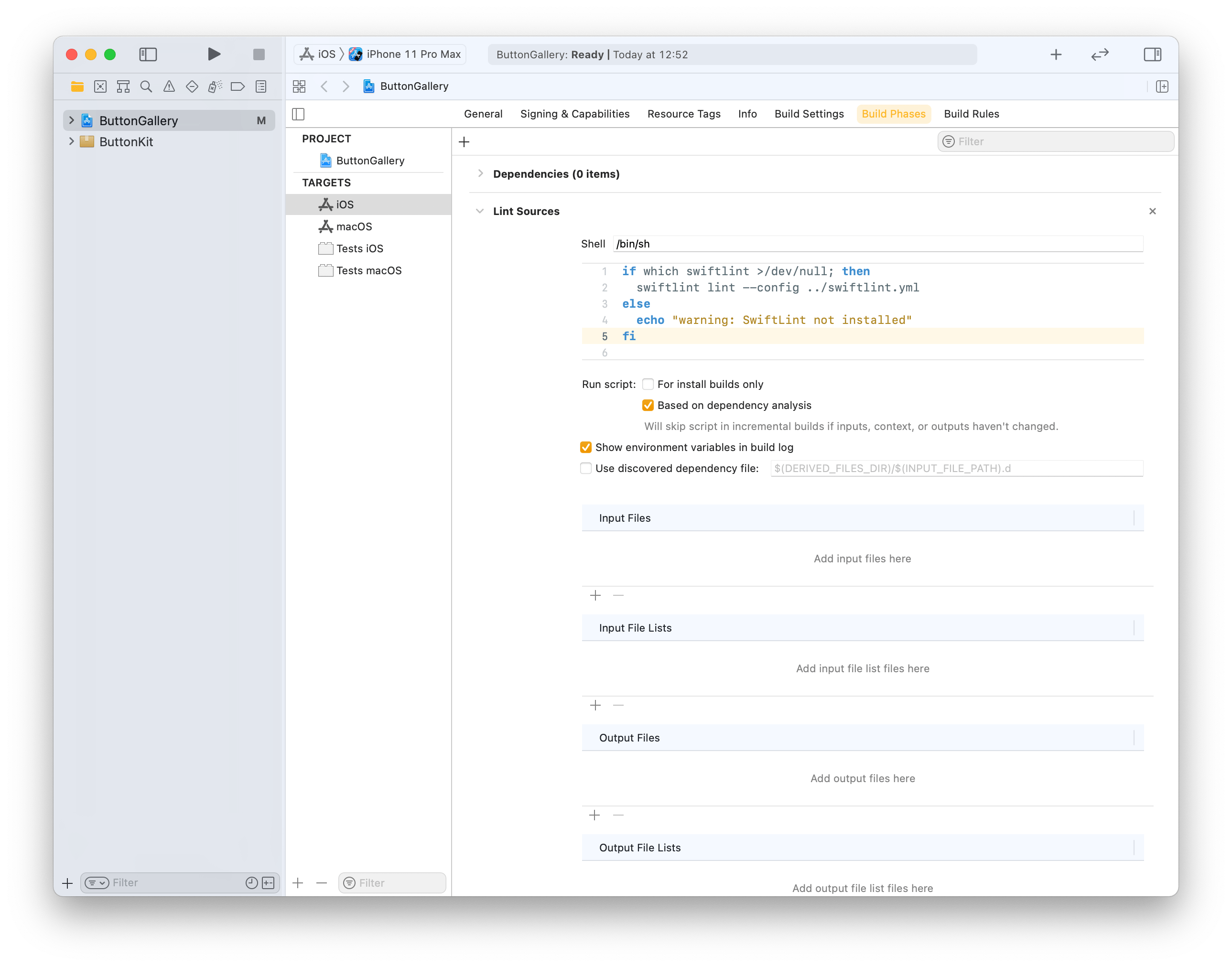 Click on the ButtonGallery project in the file navigator, then on the iOS target and build phases. Will use the + button for adding a new run script phase. Note that we already use the config argument for letting SwiftLint know where the config file exists (by default SwiftLint looks for .swiftlint.yml file in the same folder the project file is).