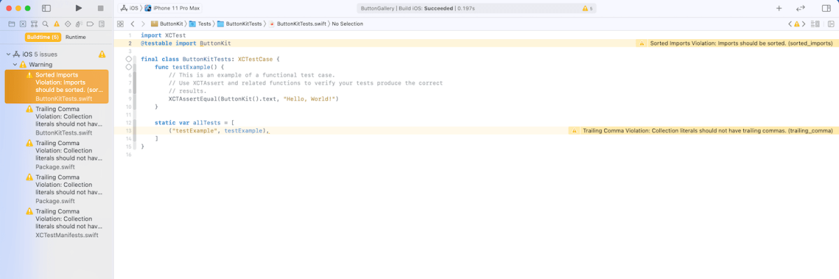 The next time the target is built it will run SwiftLint with custom configuration and show warnings and/or errors in Xcode.