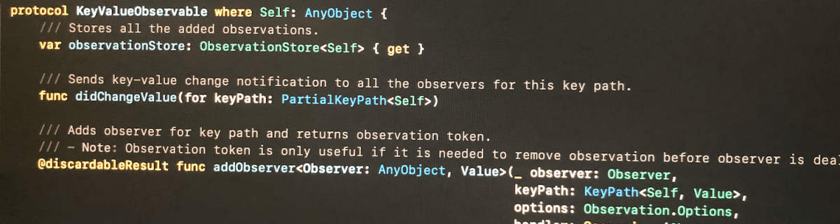 This time we added basic support for observing key paths without using key-value observing APIs known already from Objective-C times. The added KeyValueObservable protocol is easy to add to existing classes but requires manually calling didChangeValue(for:) for every property change.