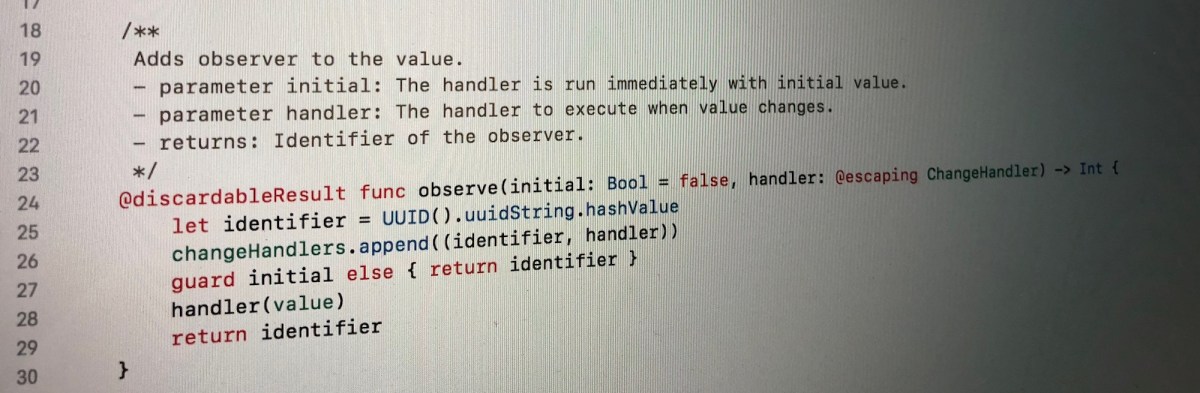 | @discardableResult func observe(initial: Bool = false, handler: @escaping ChangeHandler) -> Int { | |